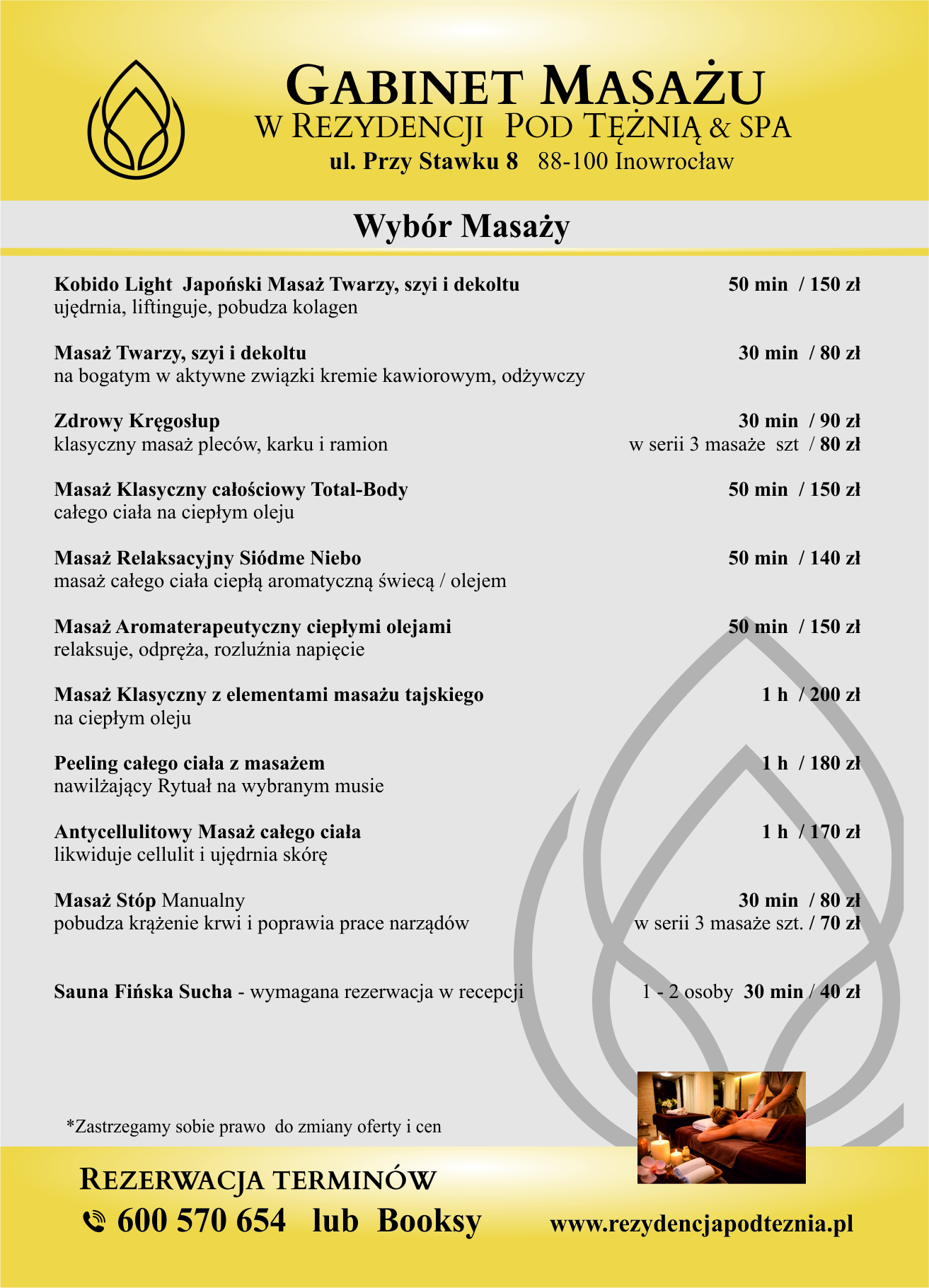 Rezydencja Pod Tężnią posiada w swojej ofercie różnorodne propozycje profesjonalnych masaży leczniczych jak i relaksacyjnych. W klimatycznym pomieszczeniu studia znajdziecie Państwo odprężenie dla ciała i zmysłów. W ofercie również trzyosobowa sauna fińska z koloroterapią.